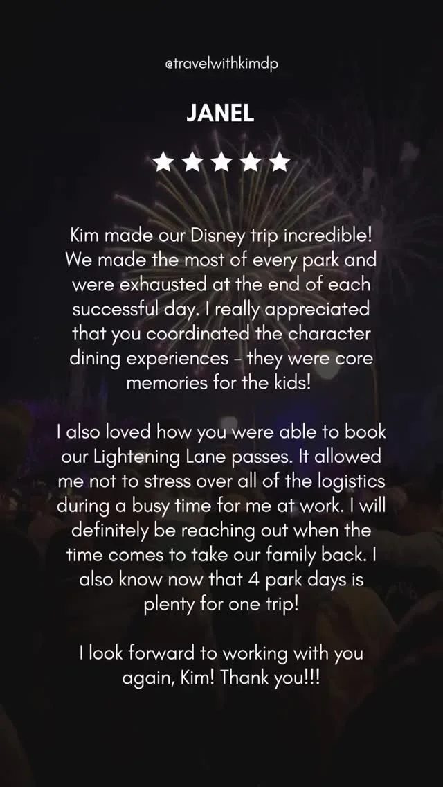 “Absolute lifesaver. That’s Kim! She just helped me plan two family trips within a packed summer camp schedule for a fabulous rate. I simply gave her my criteria and she went to work coordinating all the details. To say that I’m impressed is an extreme understatement. Kim is now my go-to planner for every trip!”